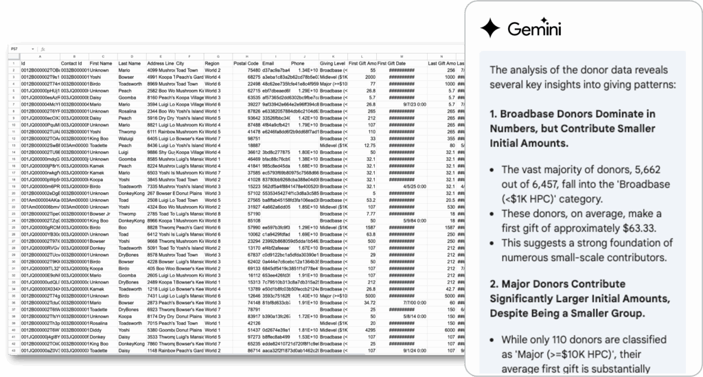 If you’re using a Google Workspace, you have Google’s AI tool called Gemini built in. It’s a very powerful tool to help with a lot of tasks, and can specifically help you when it comes to data, donor lists, and segmentation.